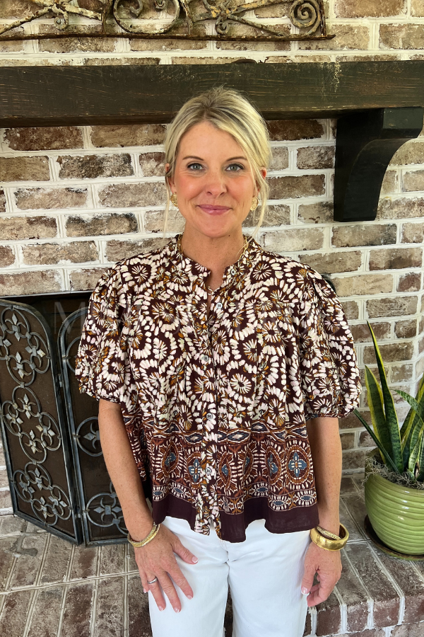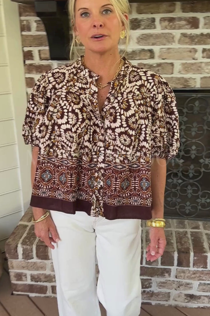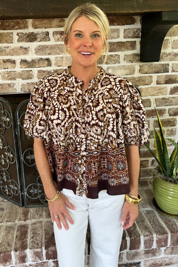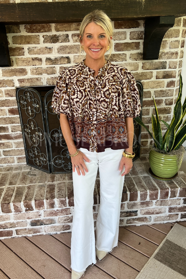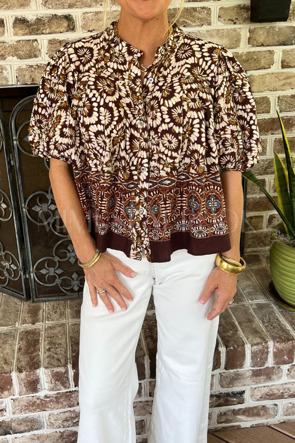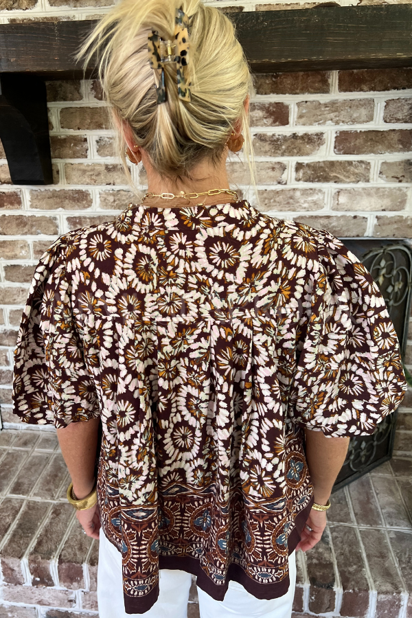 The Gaia top features a sophisticated long sleeve design adorned with an abstract pattern, offering a refined blend of style and comfort. Crafted to provide a flattering fit, this top is ideal for those seeking a versatile piece that transitions seamlessly from professional settings to casual outings.