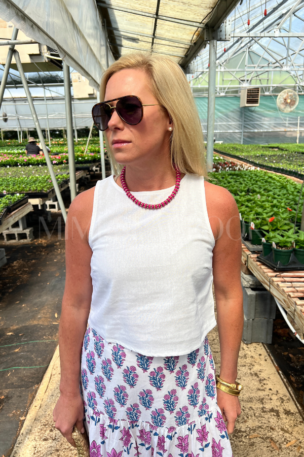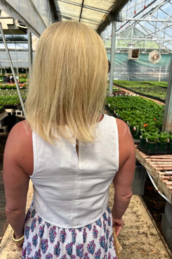 This Hatch top combines a round neckline and sleeveless design with a back button hook & eye closure for a sophisticated yet functional look. Made with linen in a solid color, this woven top is both airy and stylish. The cropped length adds a modern touch to this versatile piece.