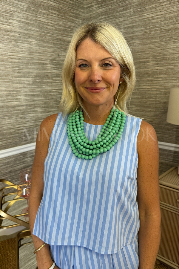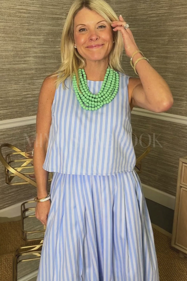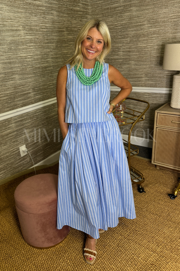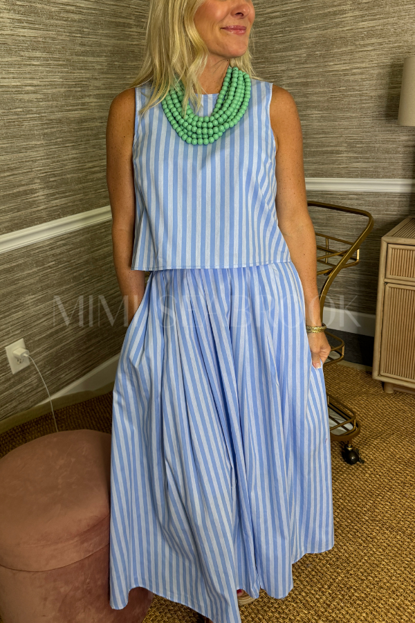 This Hugh top, in a vibrant blue color, features a stylish stripe pattern and is sleeveless for a comfortable fit. It also includes an accented wooden button back closure and is lined for added warmth. Perfect for a casual or professional look.