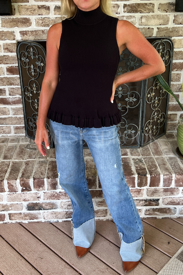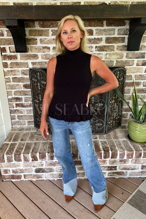The Nita sweater in black features a sophisticated mock neck and a stylish peplum silhouette, crafted from a soft blend of 55% viscose and 45% nylon. This combination ensures a comfortable fit with excellent drape and durability, making it an ideal choice for both professional and casual settings. Its tailored design enhances your shape while providing warmth and breathability.