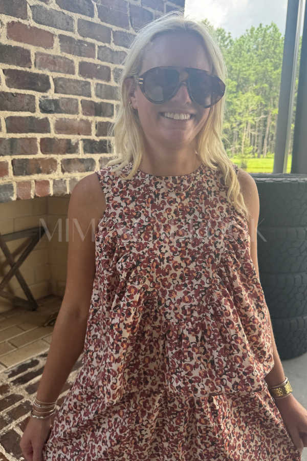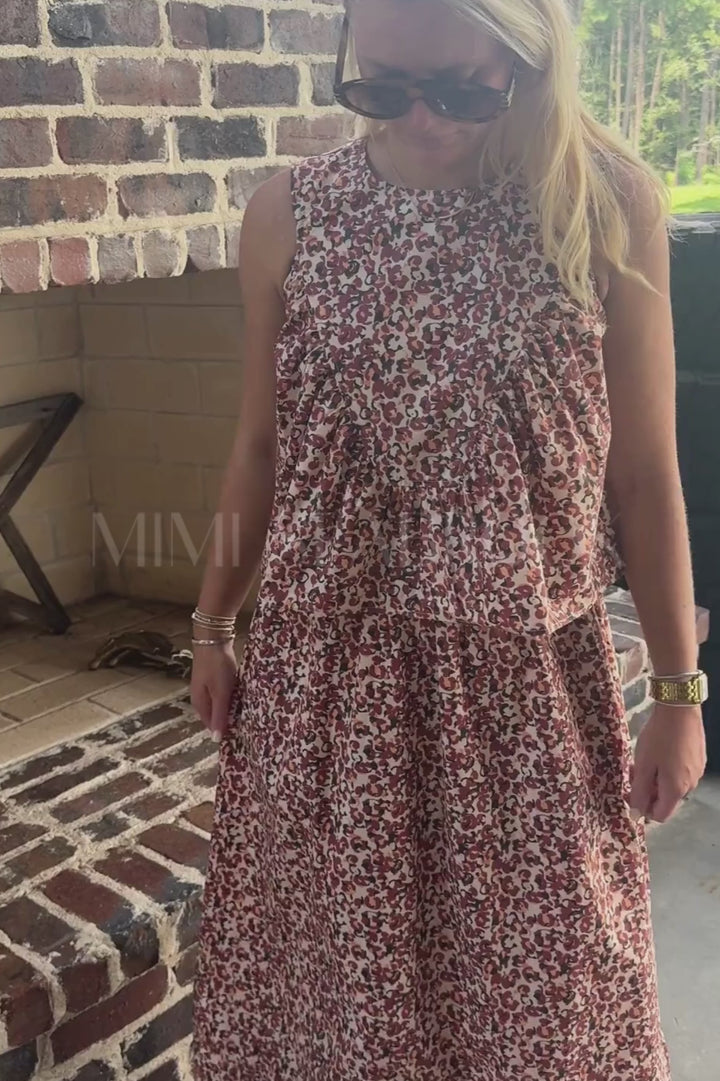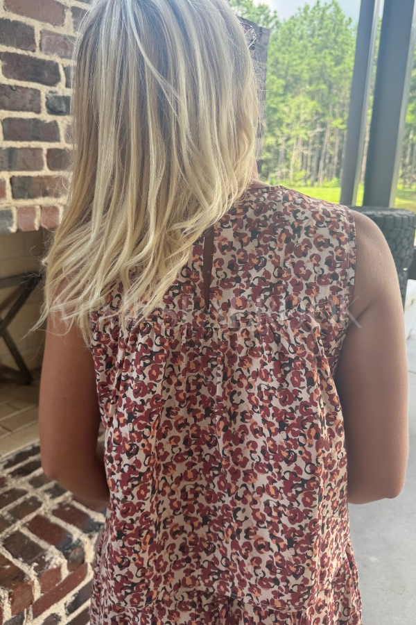 The Koras top showcases an abstract floral print on a sleeveless, tiered design that enhances its airy, flowy silhouette. Featuring a round neckline and a pleated front, this top combines elegance with subtle texture. A keyhole closure at the back adds a refined finishing touch, making it a versatile piece for both casual and polished looks.