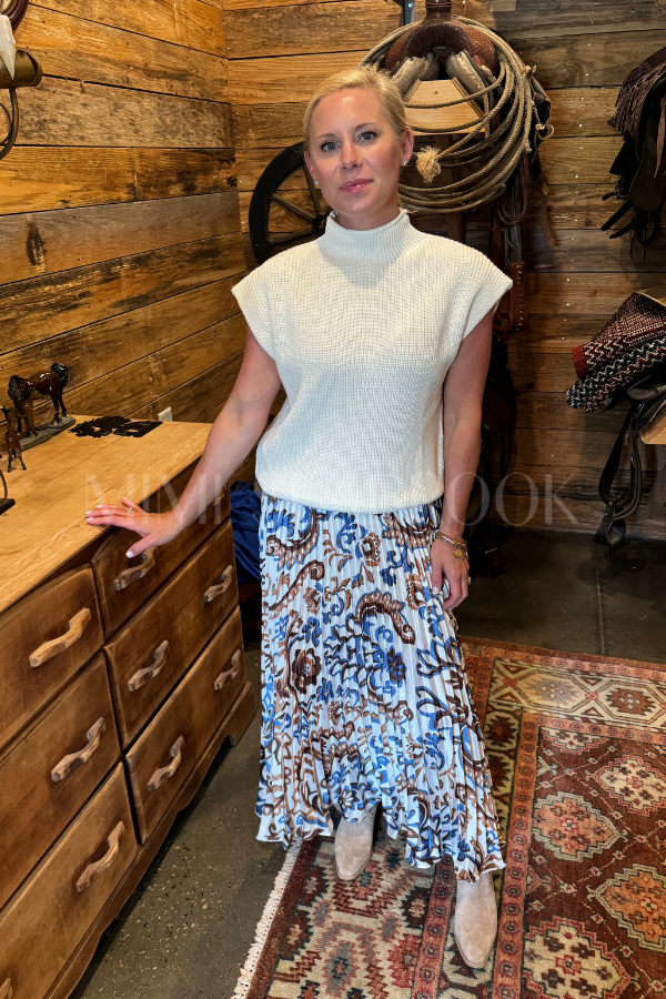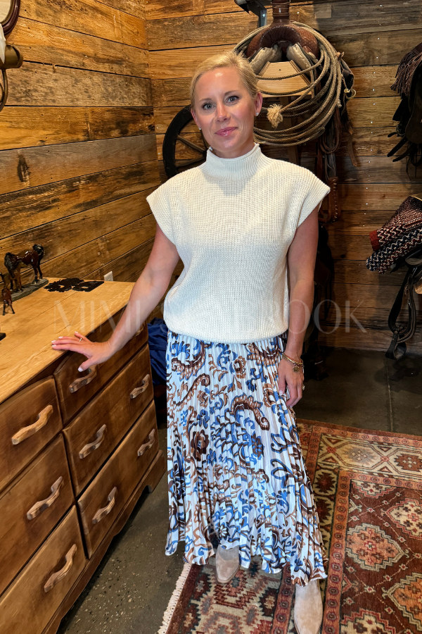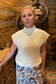 The Leslie sweater in ivory features a sophisticated mock neck design and a sleeveless cut, crafted from a comfortable blend of 60% cotton and 40% acrylic. This combination ensures softness, breathability, and durability, making it an ideal layering piece for transitional weather or polished indoor looks. Its refined silhouette offers versatility for both professional and casual settings.