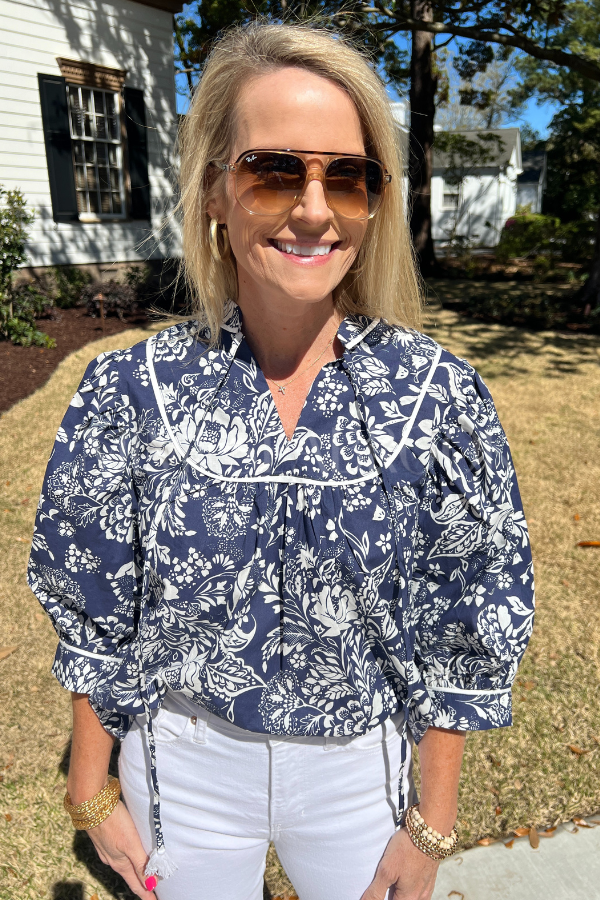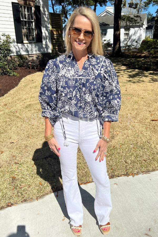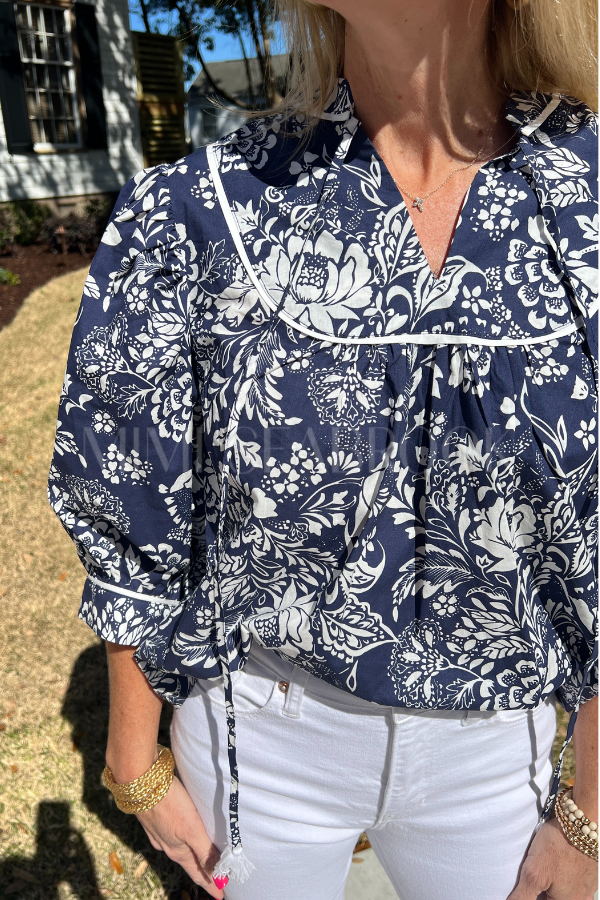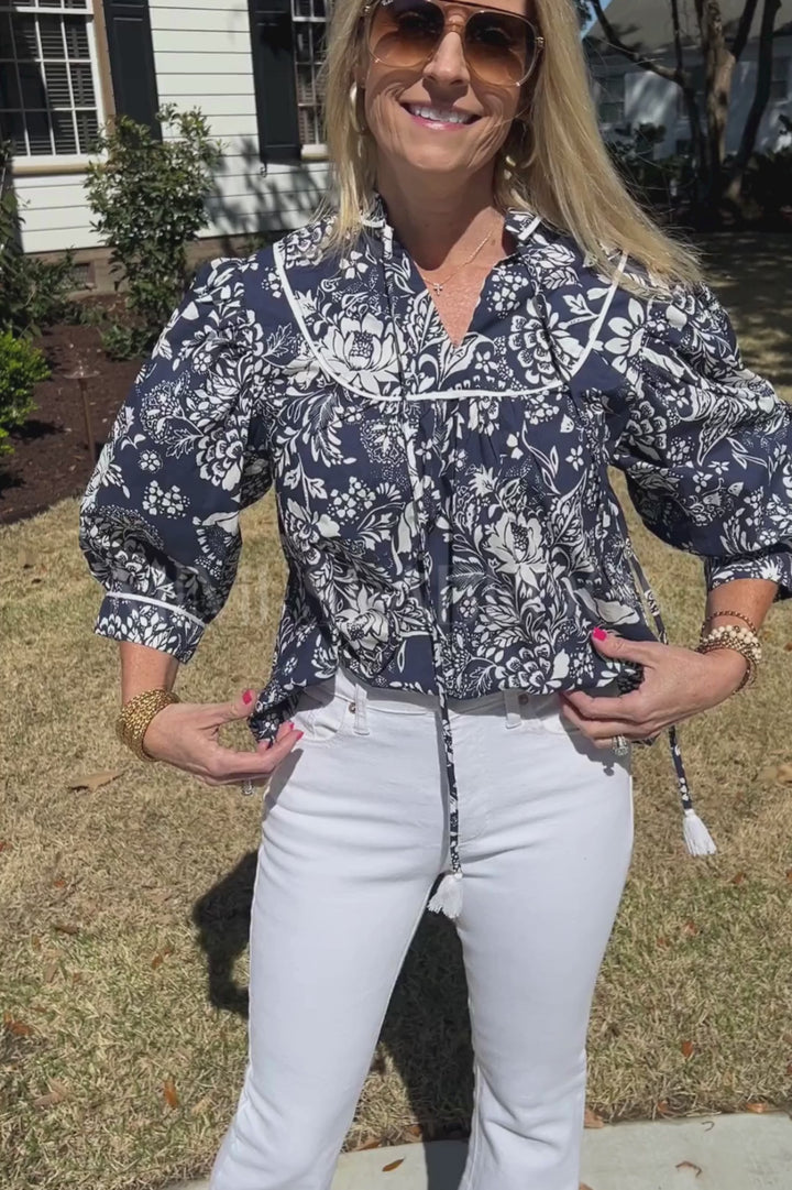 Introducing the Levana top, featuring a flattering v-neck and a self-tie with tassels. The balloon sleeves add a touch of elegance to this cotton top. Stay stylish and comfortable in this must-have piece.