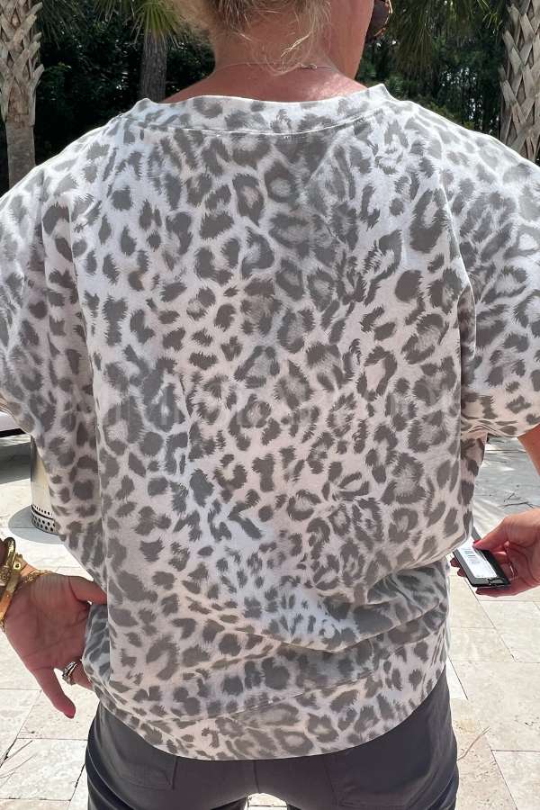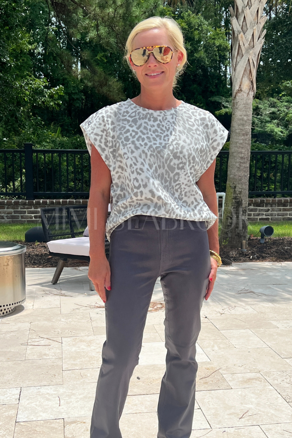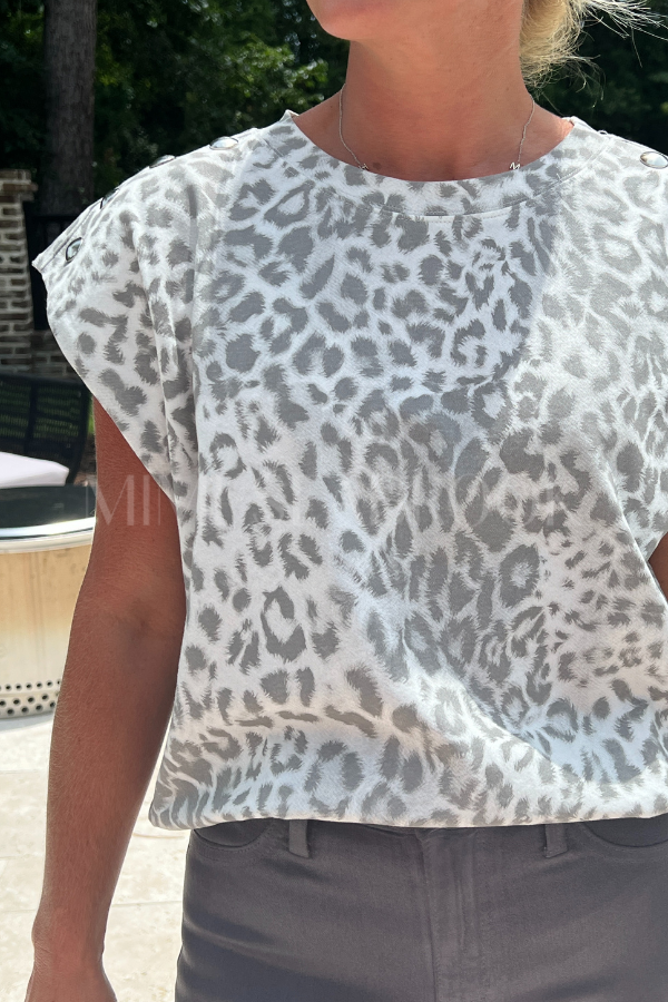 This Melbourne top is made from a comfortable jersey knit material and features a leopard print design. The studded accent shoulders add an edgy touch to this pullover muscle top. Perfect for a casual day out or a night on the town.