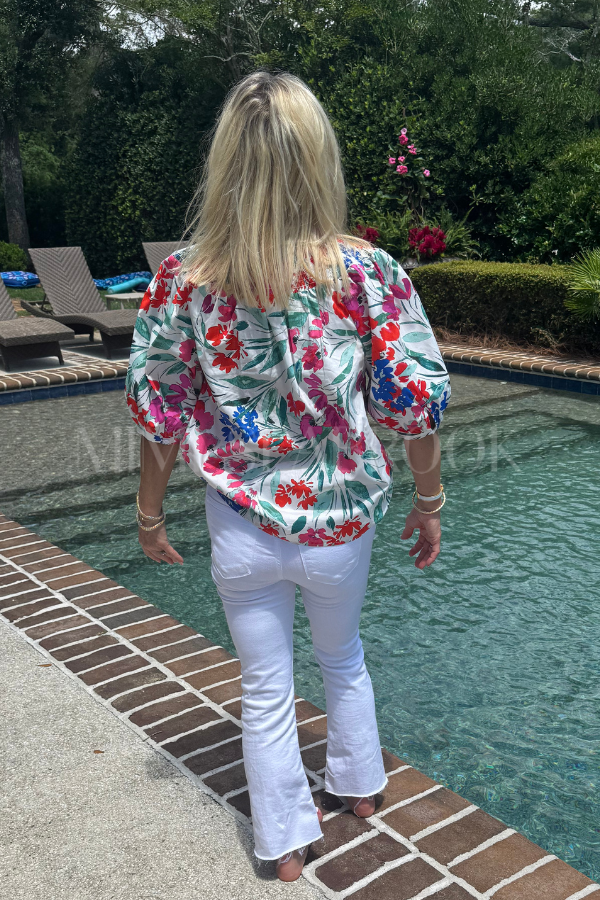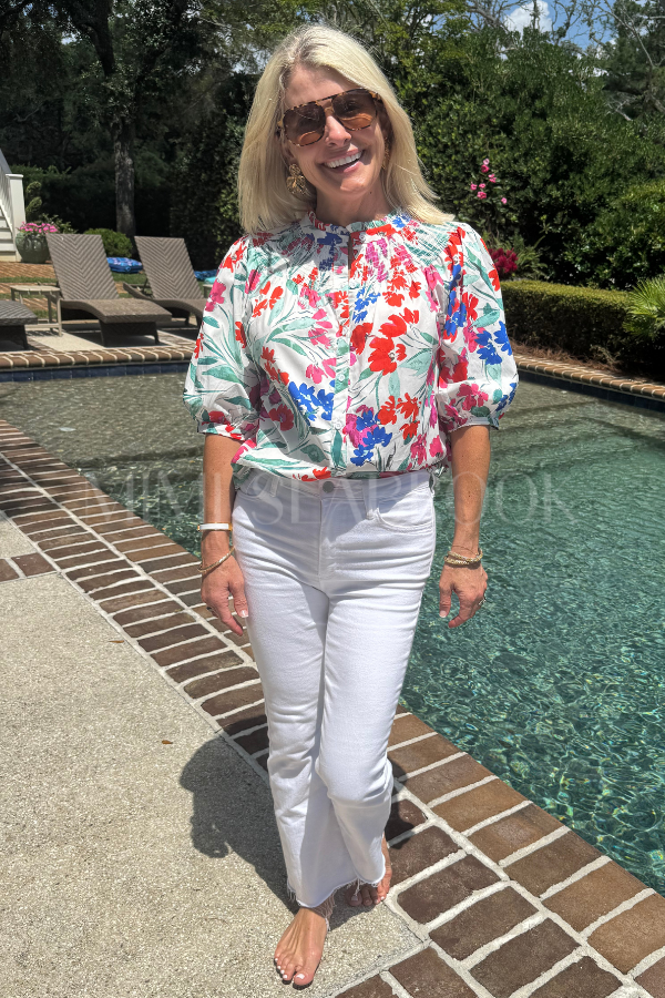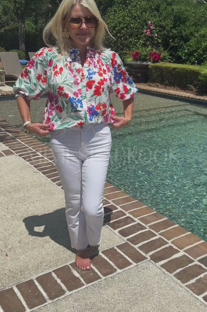 This expertly crafted Pender top combines practicality with sophisticated design. The multi-floral print creates visual interest across the button-up silhouette, while short puff sleeves add dimension. The smocked mock neck provides both structure and comfort, ensuring a flattering fit that transitions seamlessly from casual to dressy occasions.