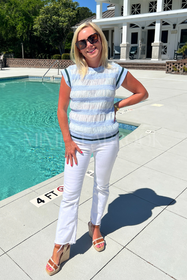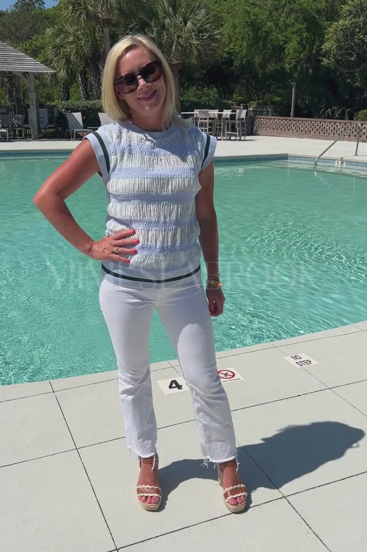 Expertly crafted with a round neckline and sleeveless design, the Shiver top offers a chic and modern look. The addition of a striped contrast band on the sleeve and hem adds a touch of sophistication. Elevate your style with this must-have piece.
