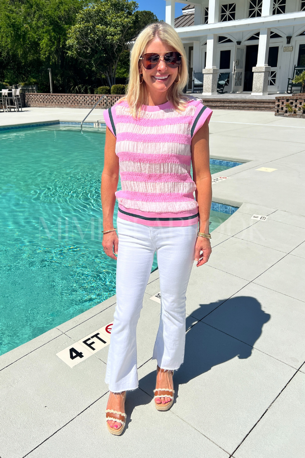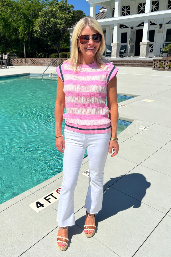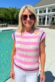 Expertly crafted with a round neckline and sleeveless design, the Shiver top offers a chic and modern look. The addition of a striped contrast band on the sleeve and hem adds a touch of sophistication. Elevate your style with this must-have piece.