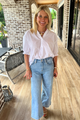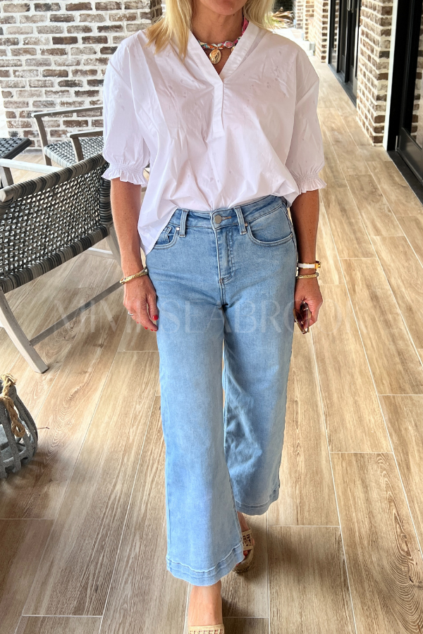 The Sonnet top features a flattering V-neck design with delicate ruffled detailing at the neck and cuffs. The balloon sleeves are both stylish and comfortable with elastic at the cuffs. The back also includes shirring for a trendy and flattering look.