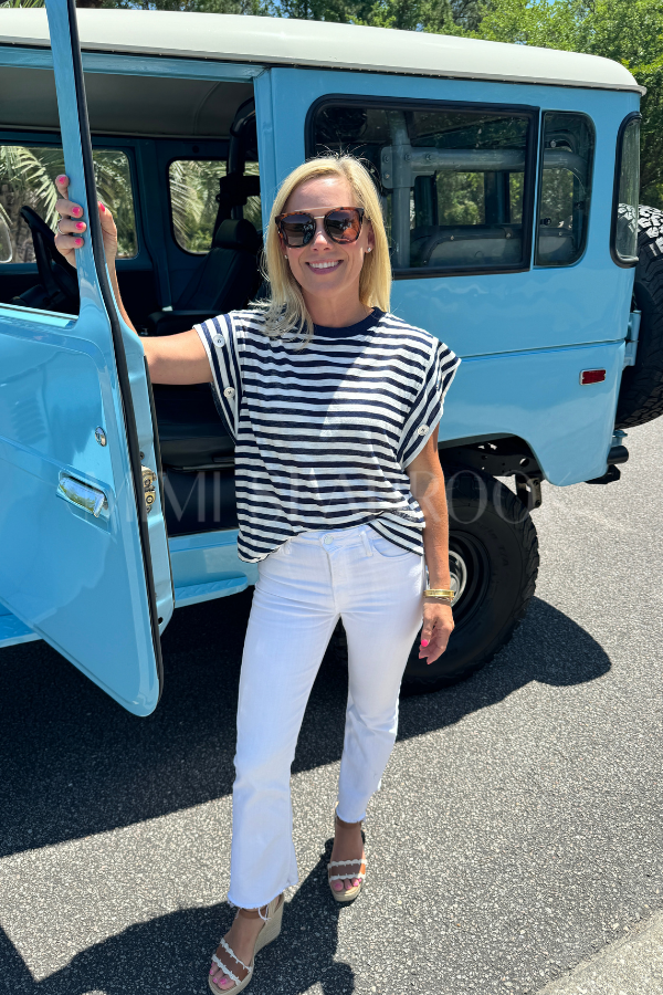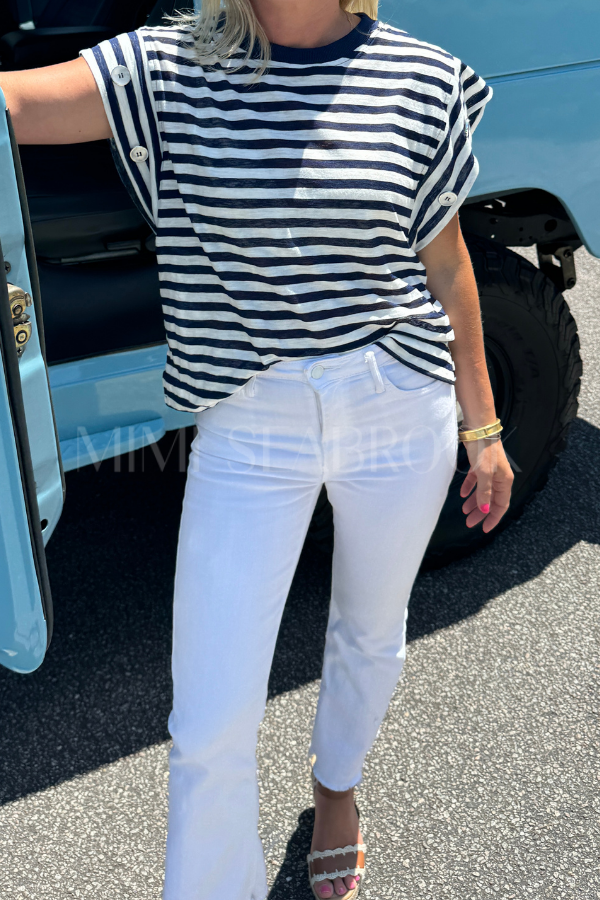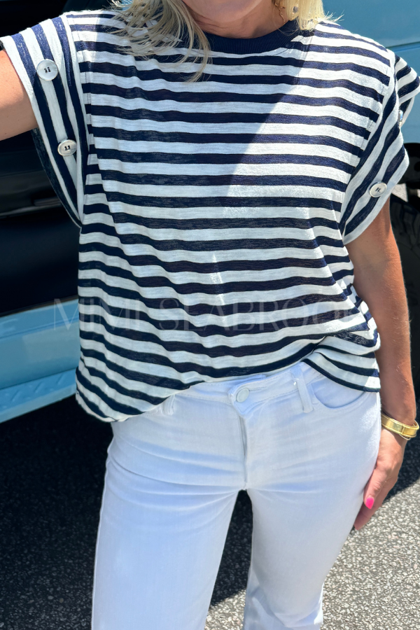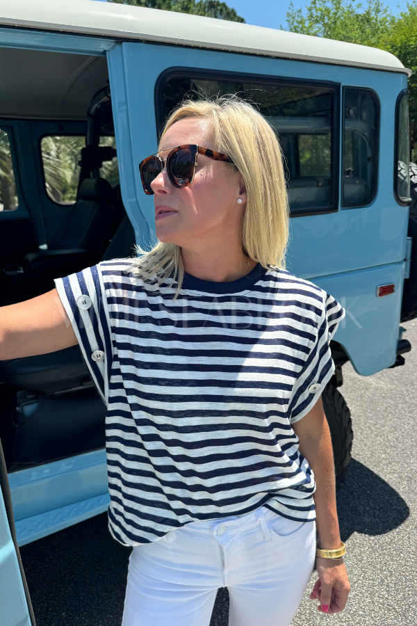 The Theron top features a chic round neckline with a contrasting band, adding a touch of sophistication to any outfit. The short sleeves and vertical/horizontal stripes create a flattering silhouette, while the sleeve button detail adds a unique touch. Made from a comfortable striped knit fabric, this top is both stylish and comfortable for all-day wear.