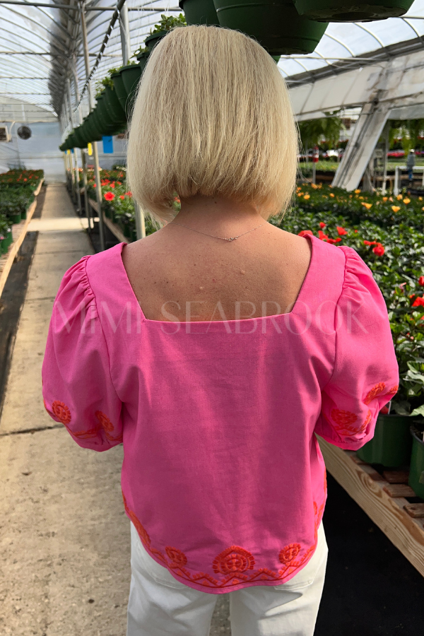 The Tonia top features a classic square neckline with intricate embroidery detailing that adds a touch of elegance to your everyday wardrobe. This versatile piece pairs effortlessly with jeans, skirts, or trousers for a polished look. The embroidered accents draw attention to the neckline, creating visual interest while maintaining a refined aesthetic.