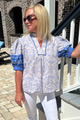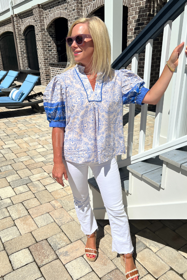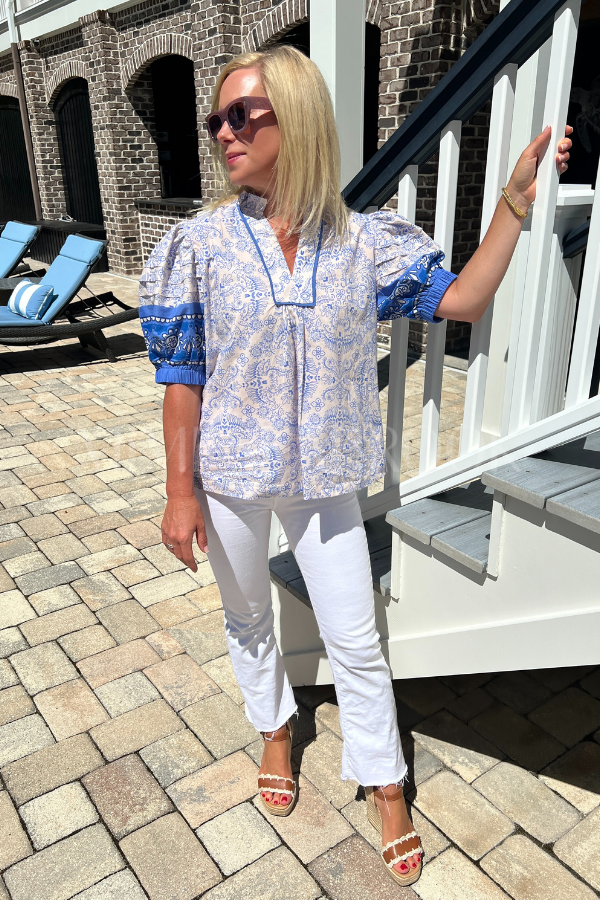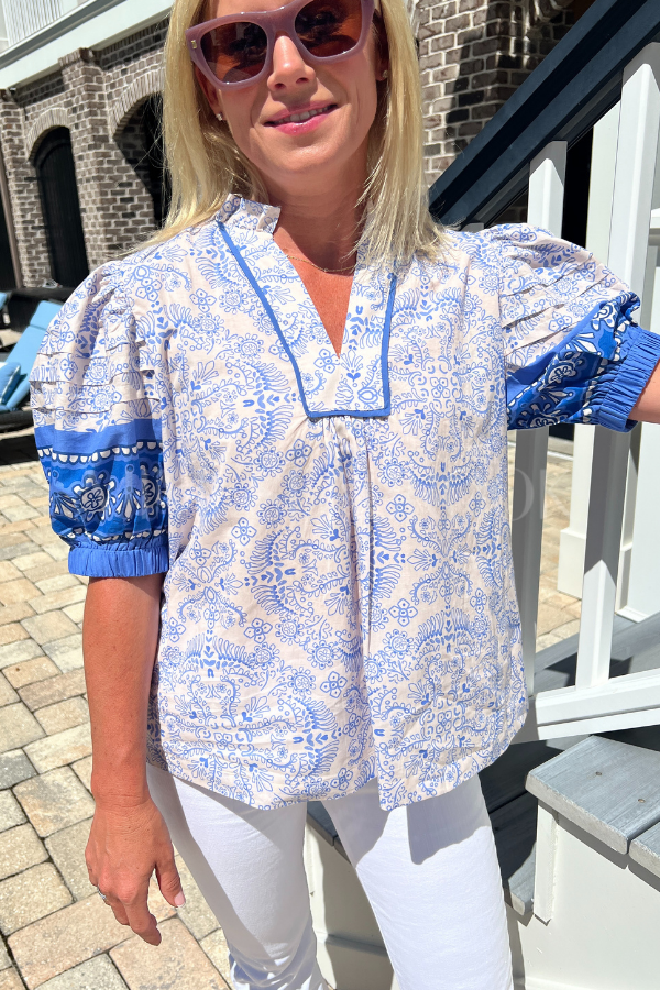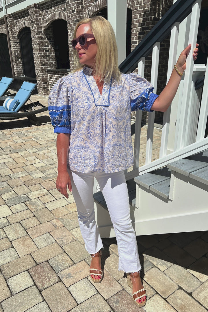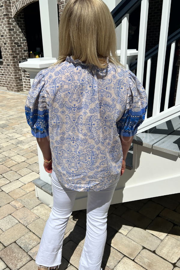 Enhance your wardrobe with the Winslow top. Crafted from a soft cotton blend, this top features a flattering v-neck and ruffled neckline for added detail. The contrasting blouse top is finished with delicate puffed sleeves and elastic cuffs, adding a touch of sophistication to any outfit.