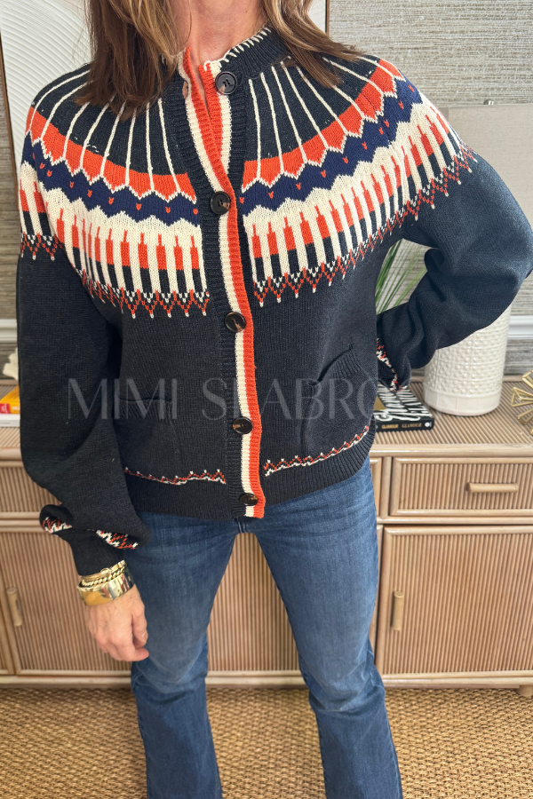 The Woodridge sweater brings vintage charm to your everyday wardrobe with its retro-inspired geometric jacquard knit pattern. This cozy round neck cardigan features classic design details that feel both nostalgic and effortlessly cool. Perfect for layering over your favorite tees or dressing up with a collared shirt, it's the kind of piece that makes getting dressed fun.