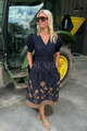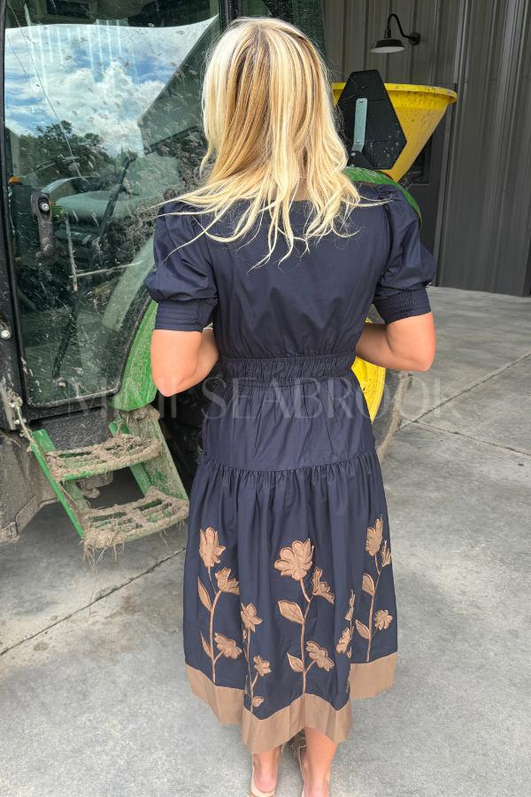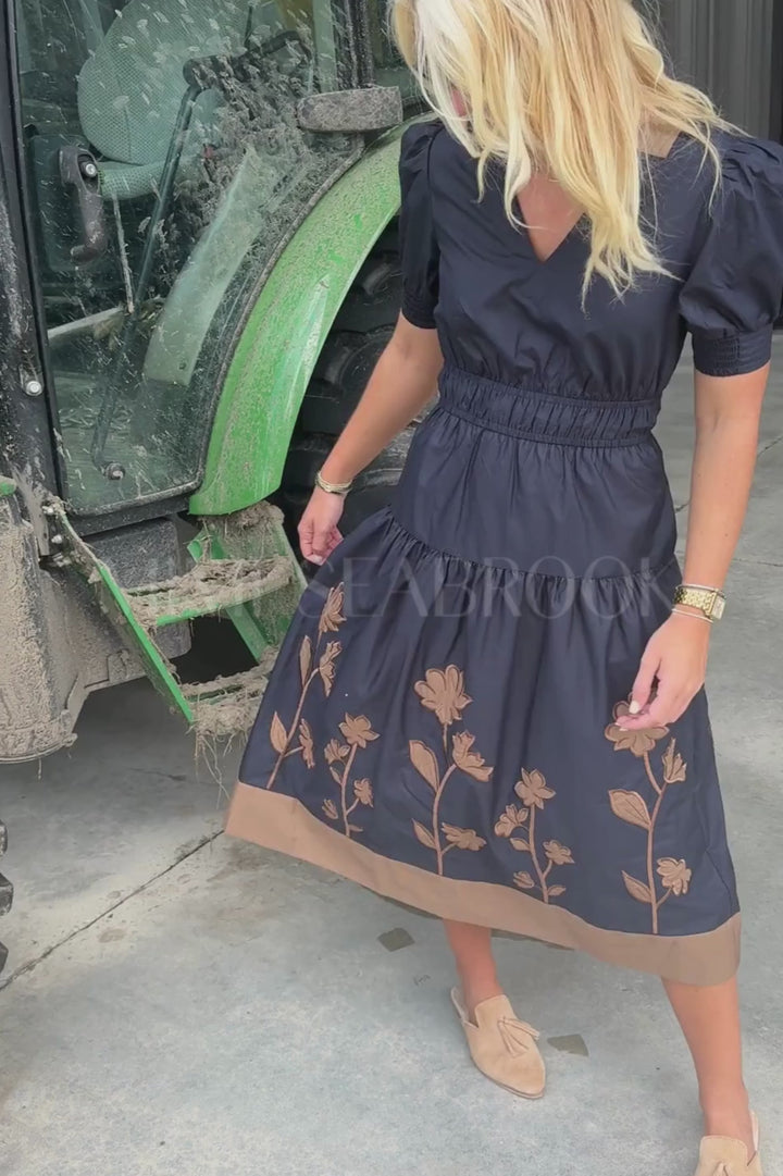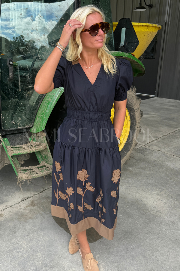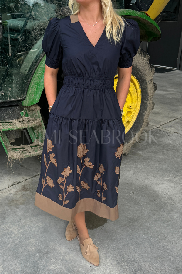 The Abba dress features a flattering V-neckline and short sleeves with half-smocked cuffs for a refined touch. Its elasticized waist enhances silhouette definition while ensuring comfort throughout the day. The contrasting details add subtle visual interest, making this midi dress a versatile choice for both professional and casual settings.