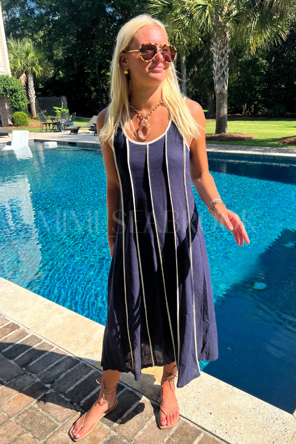 The Althea Dress features a classic navy fabric accented with a crisp white stripe, creating a timeless sundress perfect for warm-weather occasions. Its design balances elegance and comfort, making it an ideal choice for both casual outings and refined summer events. Crafted to offer a flattering fit, this dress combines style with ease, ensuring you stay cool and chic throughout the day.