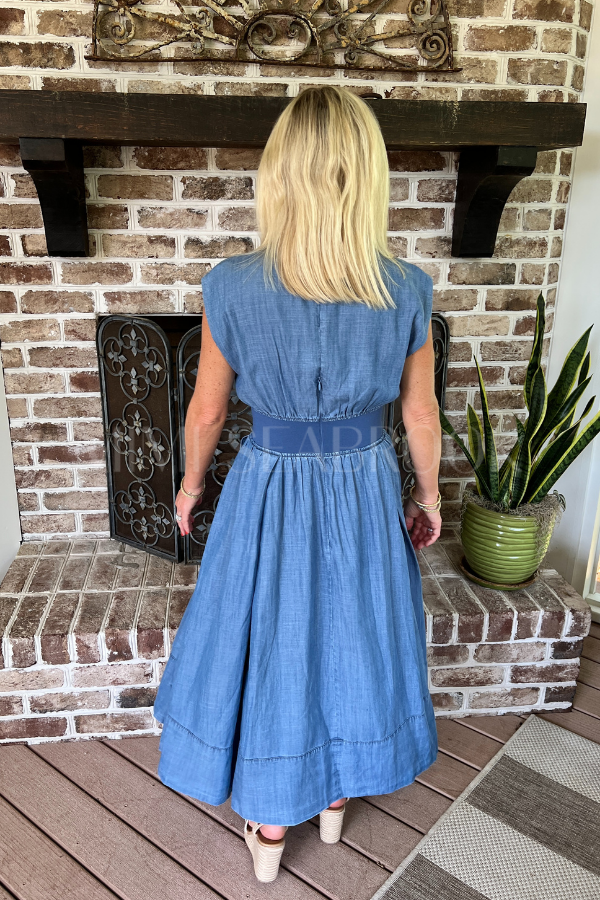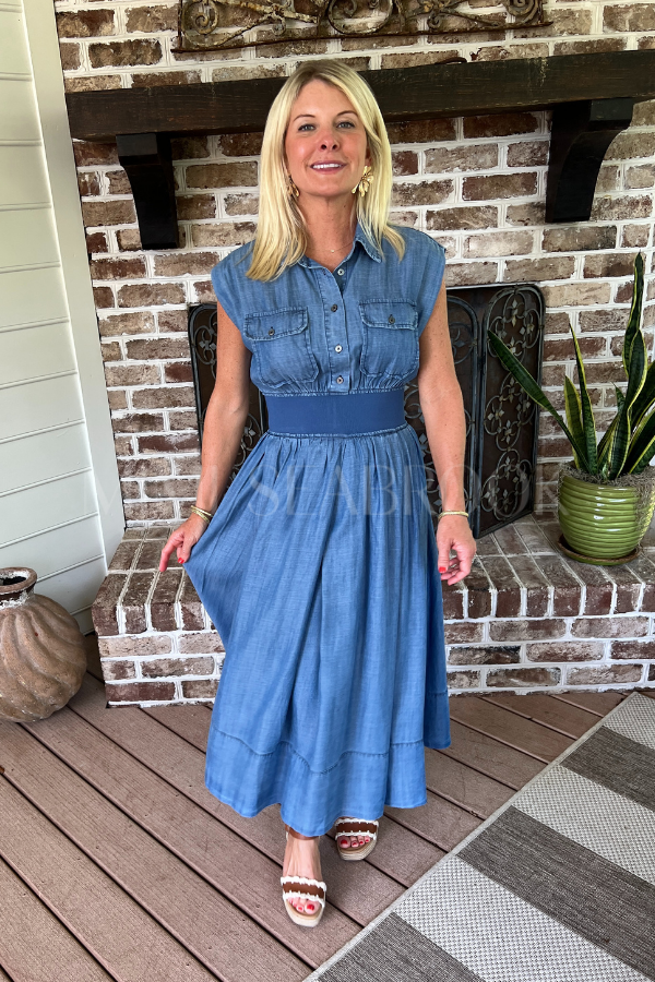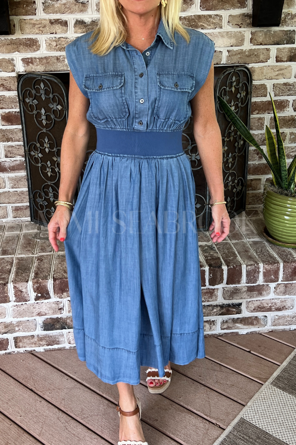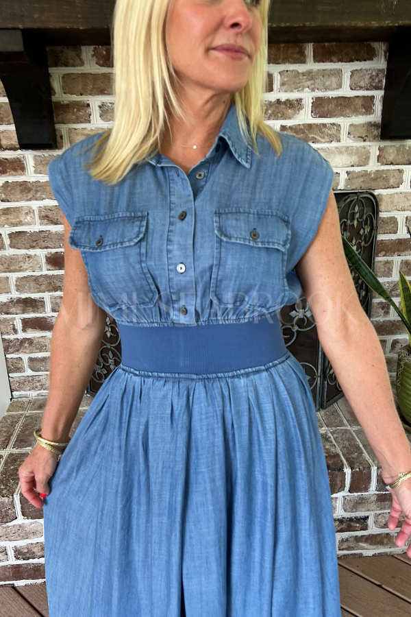 The Ballou dress features a classic shirt collar and a full button-down front for a polished look. Its cap sleeves are finished cleanly, adding subtle sophistication. An elasticized wide waistband ensures a comfortable, flattering fit, while two flap chest pockets provide practical style details. This dress combines structured elements with ease, making it a versatile addition to your wardrobe.