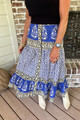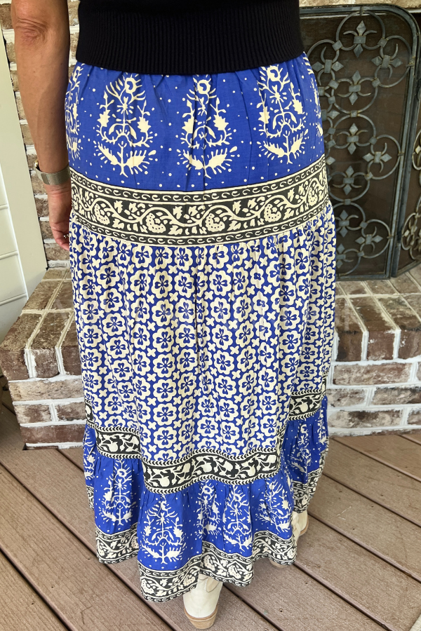 Crafted from lightly structured cotton poplin, this tiered maxi skirt features a flounce hem that adds subtle movement and elegance. The button front is detailed with mother of pearl closures and a contrasting trim down the front, enhancing its refined design. An elasticized waistband ensures a comfortable fit, while discreet side seam pockets offer practical convenience. Ideal for a polished yet effortless look, this skirt balances classic craftsmanship with modern functionality.