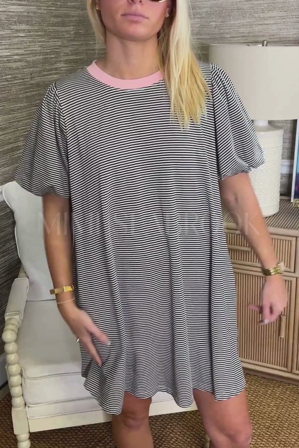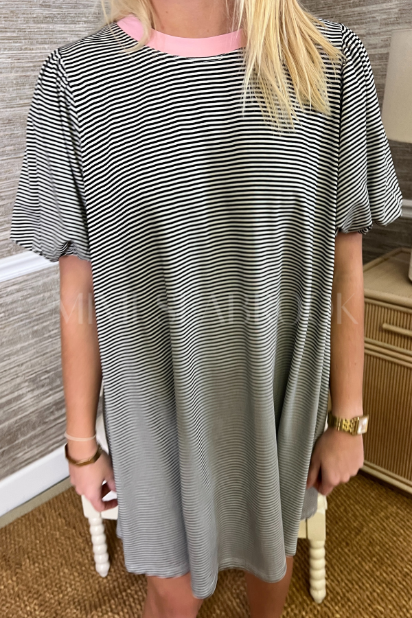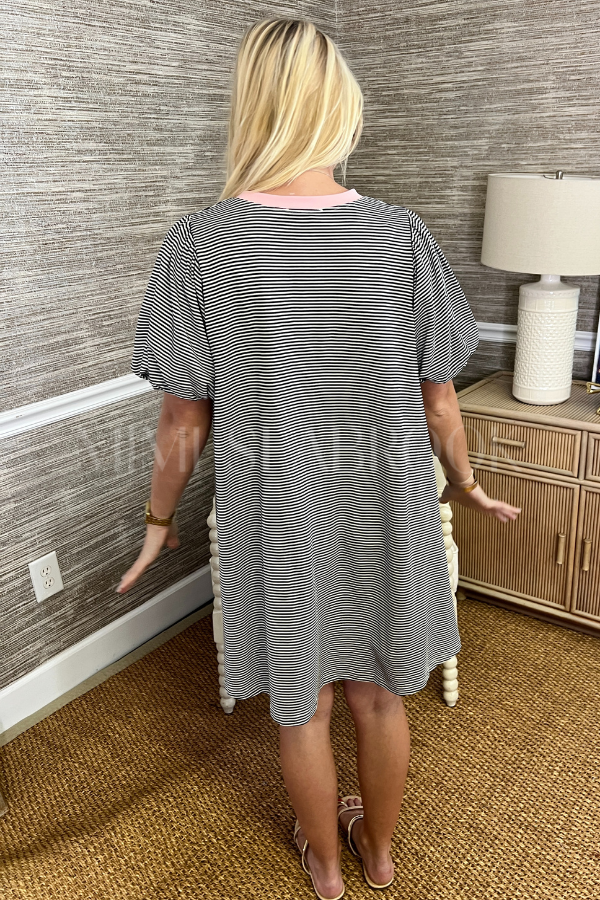 Stripes meet sophistication in this charming mini dress that's as practical as it is pretty. Featuring voluminous puff sleeves for a touch of drama and hidden side pockets—because who doesn't love functional fashion? The fully lined silhouette skims your figure beautifully while the classic striped knit keeps things fresh and fun.