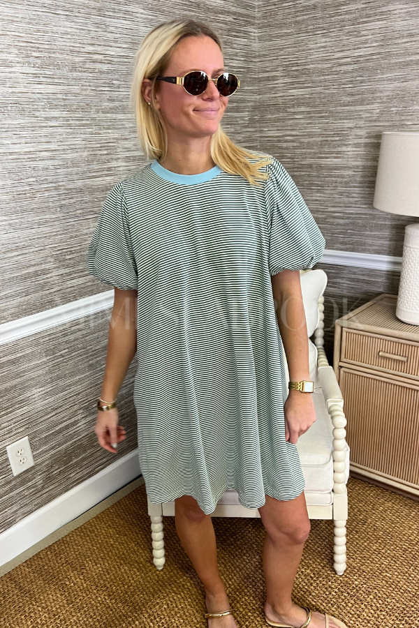 Stripes meet sophistication in this charming mini dress that's as practical as it is pretty. Featuring voluminous puff sleeves for a touch of drama and hidden side pockets—because who doesn't love functional fashion? The fully lined silhouette skims your figure beautifully while the classic striped knit keeps things fresh and fun.