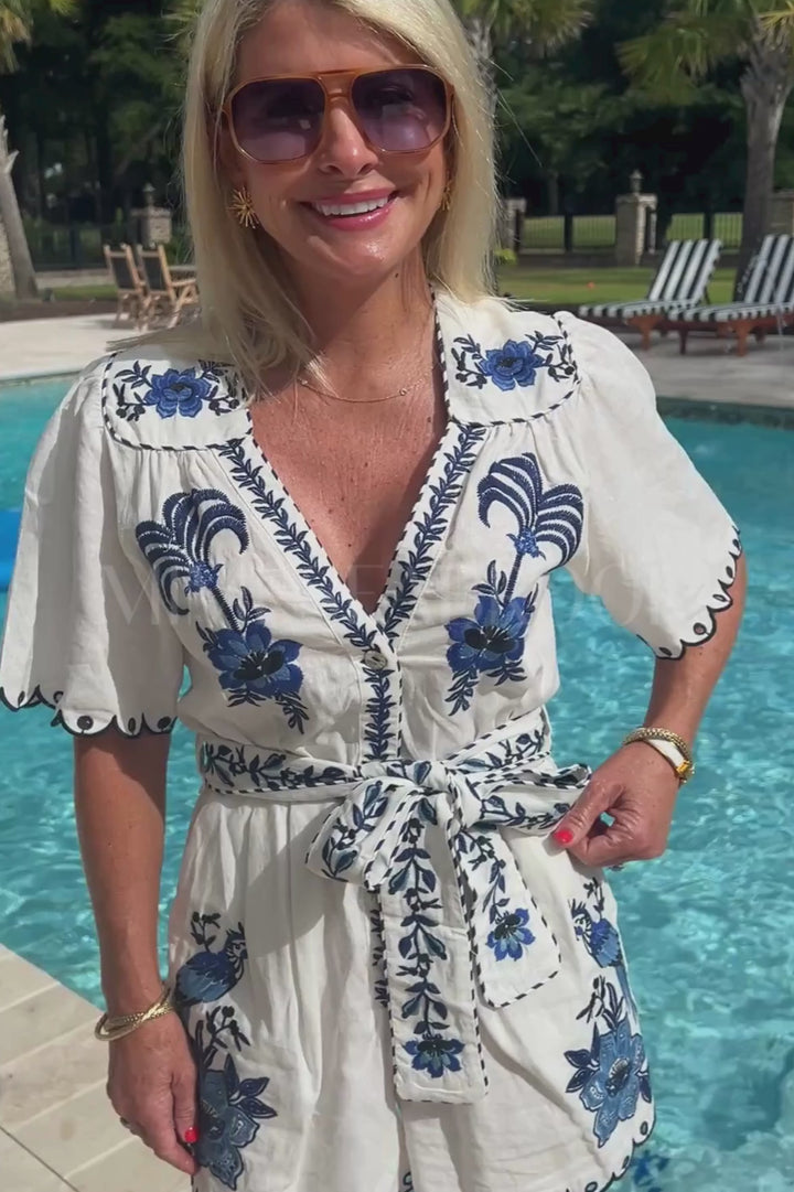 Step into a serene woodland fantasy with the Blue Delicate Forest Richelieu Embroidered LENZING™ ECOVERO™ Euroflax™ Romper. Adorned with intricate blue floral embroidery, this romper flaunts a charming V neckline and playful scalloped edges. Crafted from responsible materials, its breezy silhouette and waist tie exude effortless elegance, capturing the essence of nature’s tranquility in every stitch. Ideal for embracing laid-back elegance with a touch of whimsy.