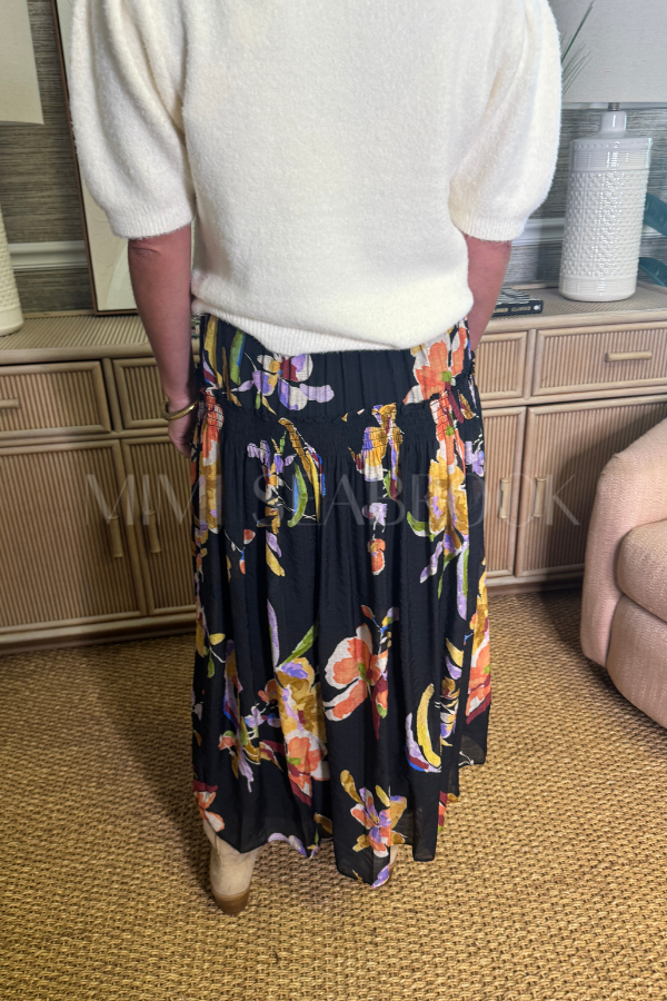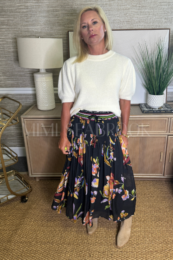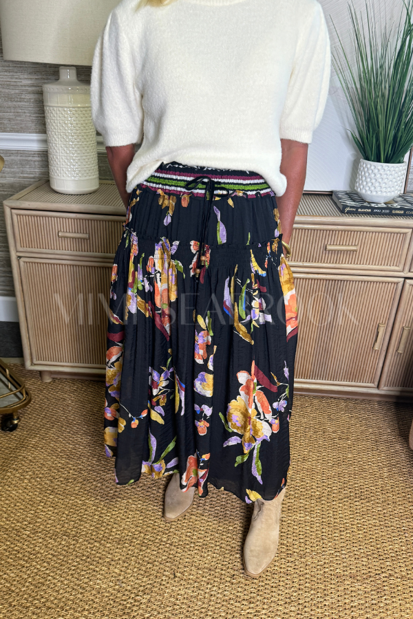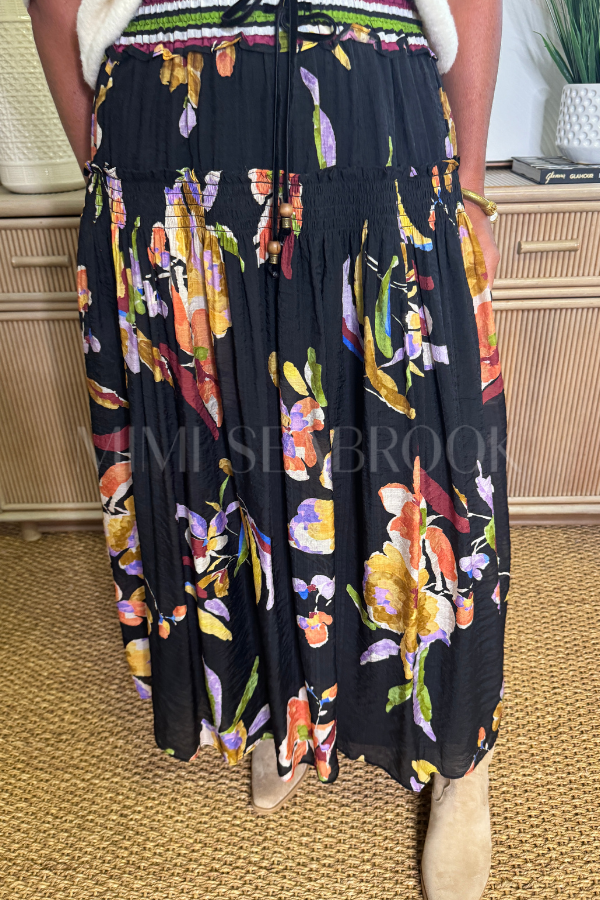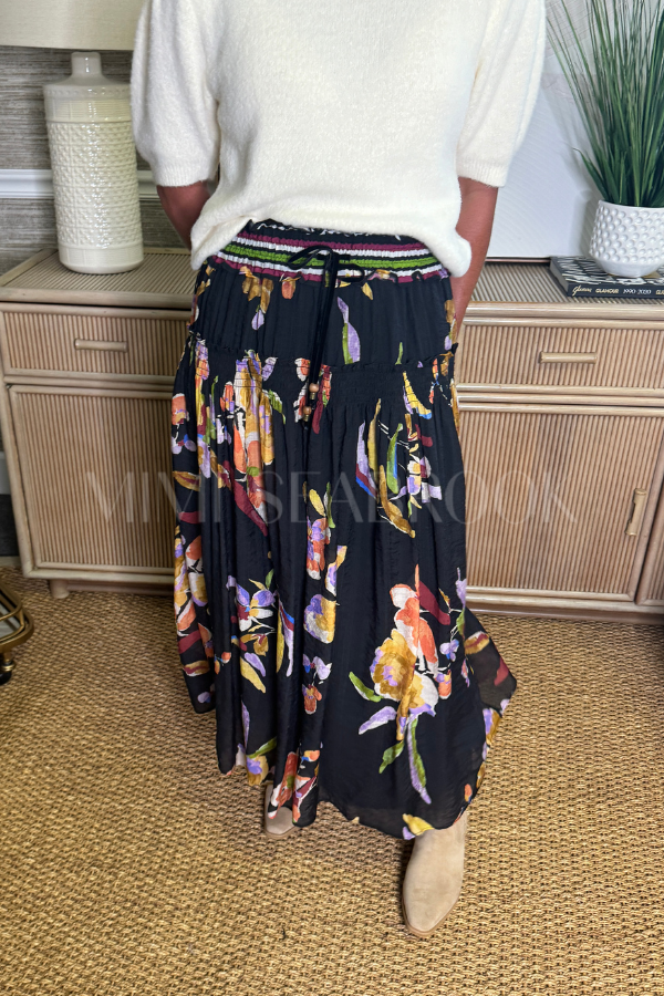 The Edda skirt is a beautifully crafted long floral skirt designed to combine elegance with comfort. Its flowing silhouette and delicate floral pattern make it an ideal choice for both casual outings and special occasions.