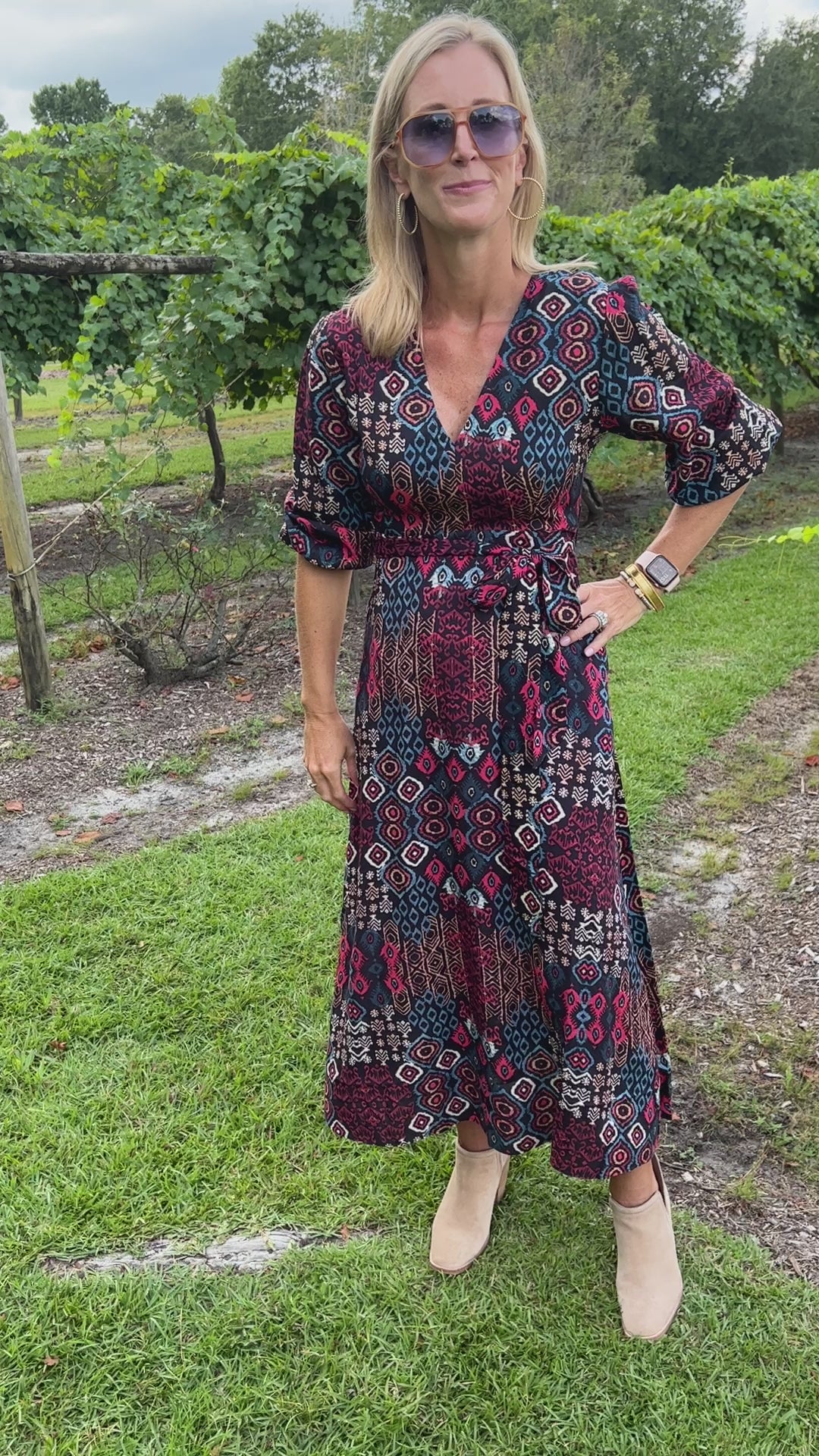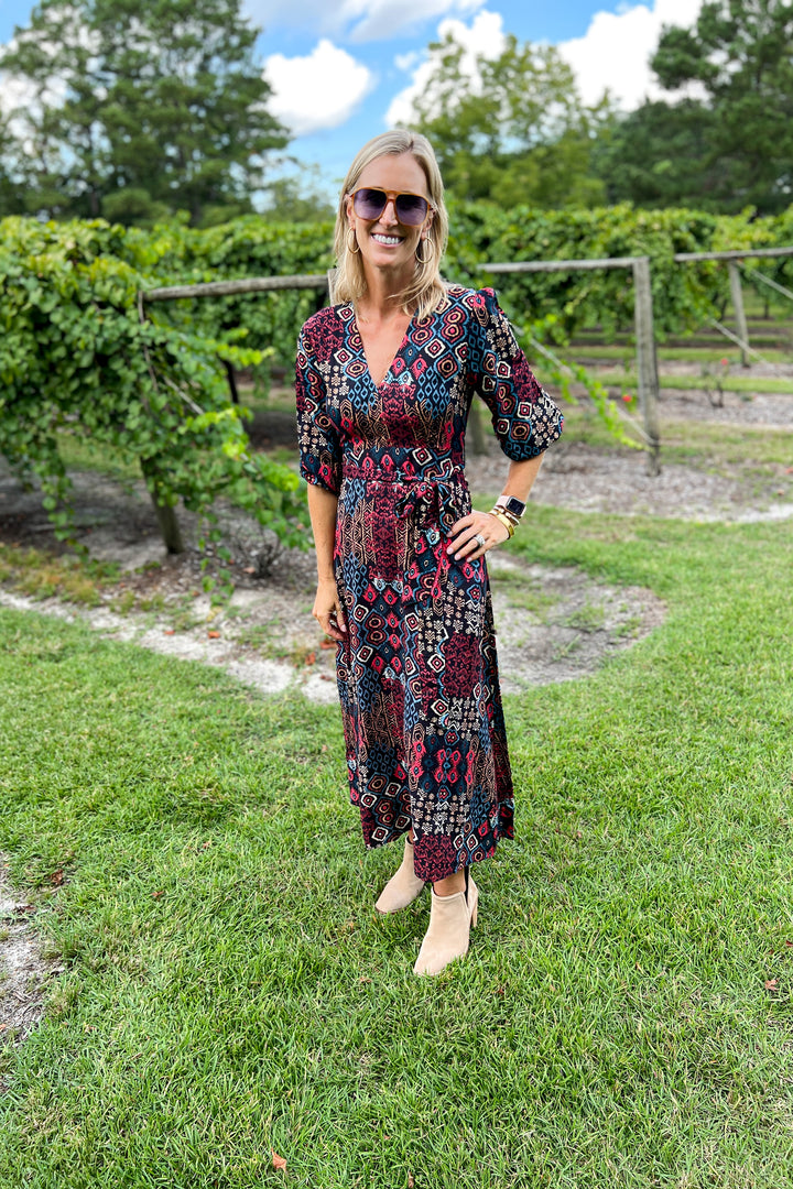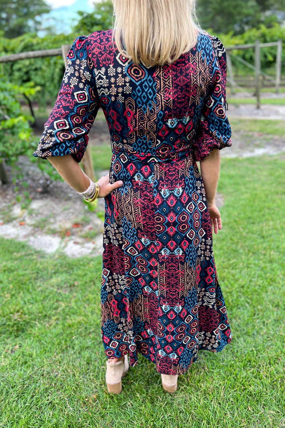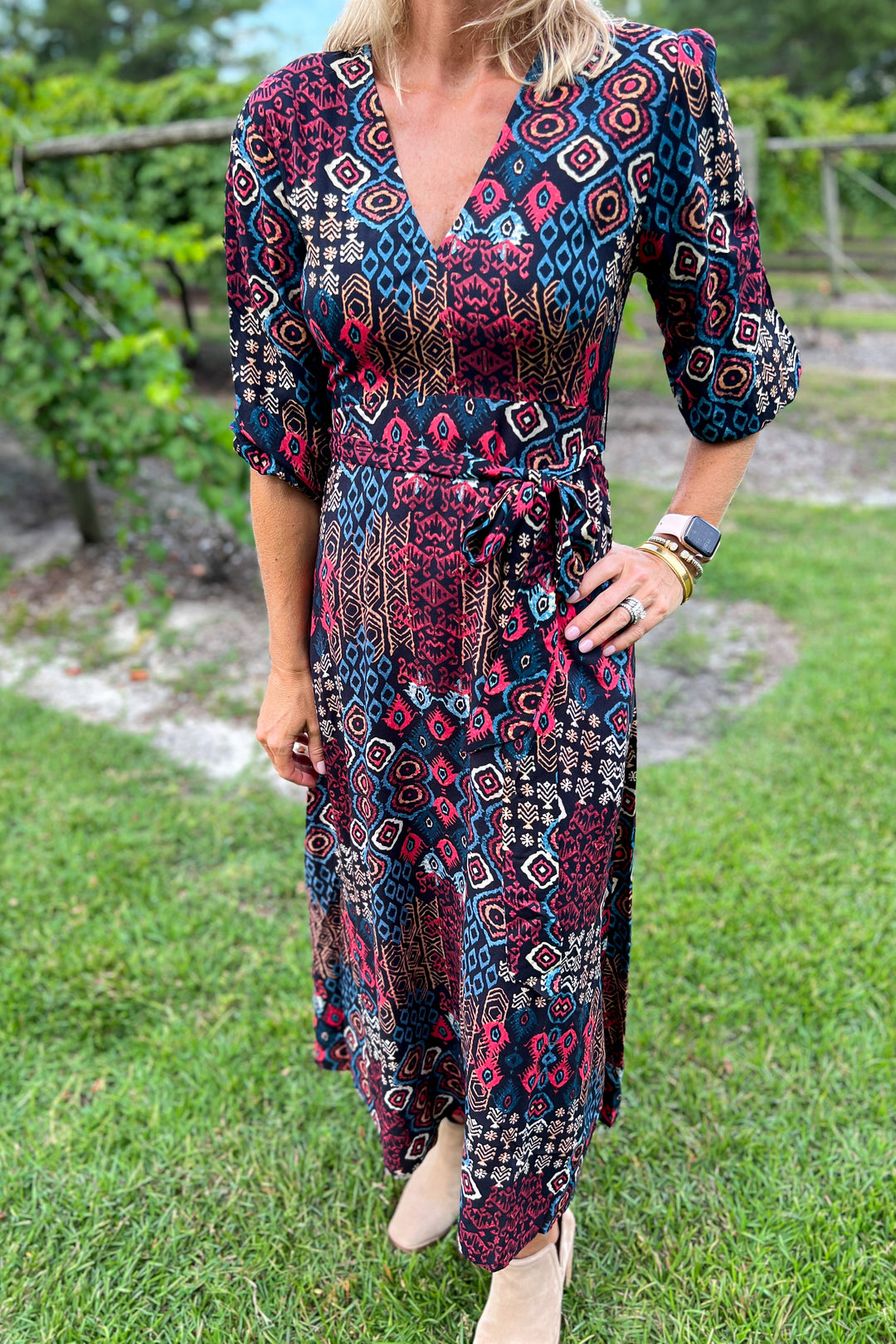 The Fata dress by King + Pitt is perfect for any occasion, with a classic, tie waist and a timeless aztec print. Crafted from lightweight material, this sophisticated dress is easy to wear all day long. The flattering, long length adds a touch of sophistication, making it a wardrobe essential. Lori is 5’5’ and wearing an XS.