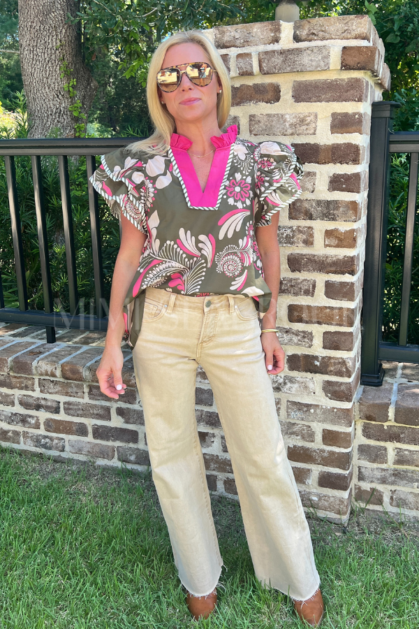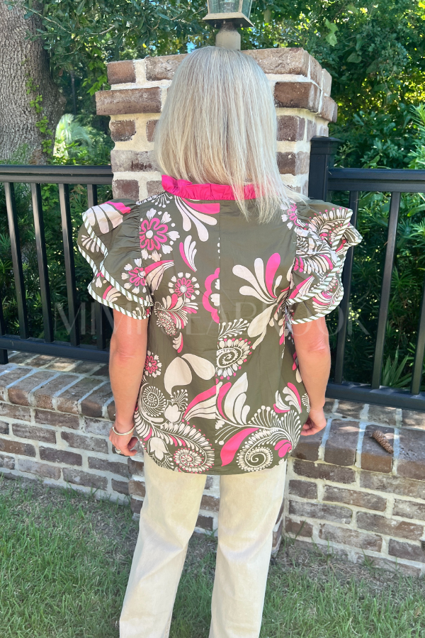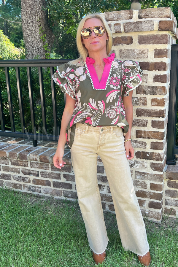 Embrace effortless charm with the Halo top, featuring a playful paisley print and fluttery tiered sleeves that dance with every move. The V-neck pops with a contrasting ruffle accent, adding a flirty touch to soft, breathable cotton perfect for sunny days or casual outings.