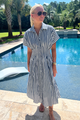 The Harbaugh dress features a sophisticated striped pattern complemented by a tailored collar detail. This versatile design transitions seamlessly from professional settings to casual outings, offering both structure and comfort. The classic collared silhouette creates a polished, timeless aesthetic that flatters various body types.