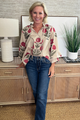 This Honeybird top features a stunning floral print and ¾ cuff bubble sleeves. The front self button closure and adjustable tie at the ruffle finish neckline add a touch of femininity. Unlined and woven, this top offers comfort and effortless style.