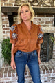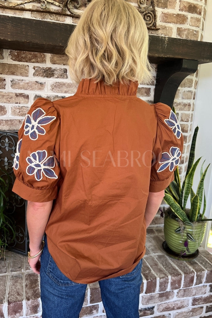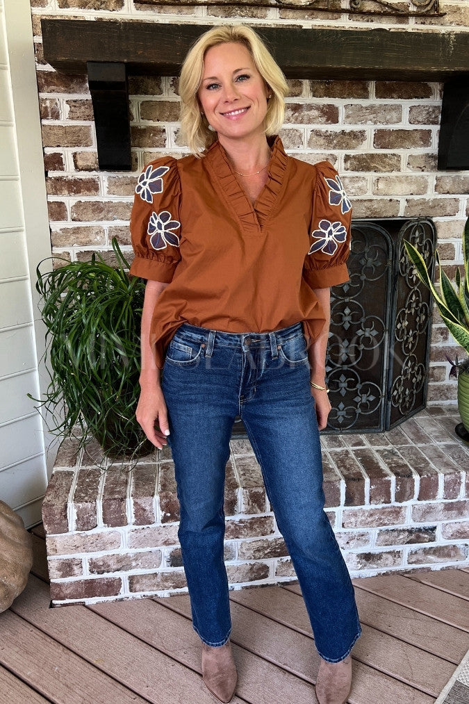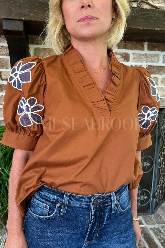 The Jaylani top is pure fun with its solid ruffle-accented V-neck that flirts with every move. Charming floral embroidered applique decorates the short puff sleeves, making this playful piece perfect for brightening up any day with a touch of whimsy and style.
