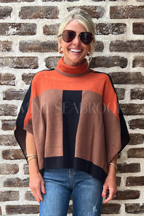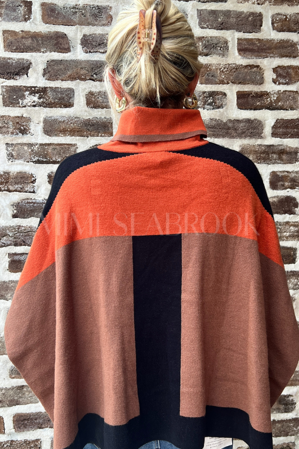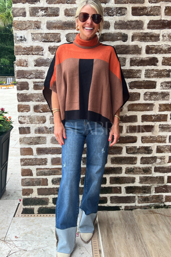 The Jayne sweater features a sophisticated colorblock poncho design that combines style with comfort. Crafted for versatility, this piece effortlessly layers over your wardrobe, providing warmth without sacrificing breathability. Its structured yet relaxed fit makes it ideal for both casual outings and refined occasions