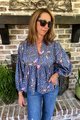 Each hue has been individually layered on in the traditional hand blocking process. Contrast prints enhance the thoughtful design details of this top.
