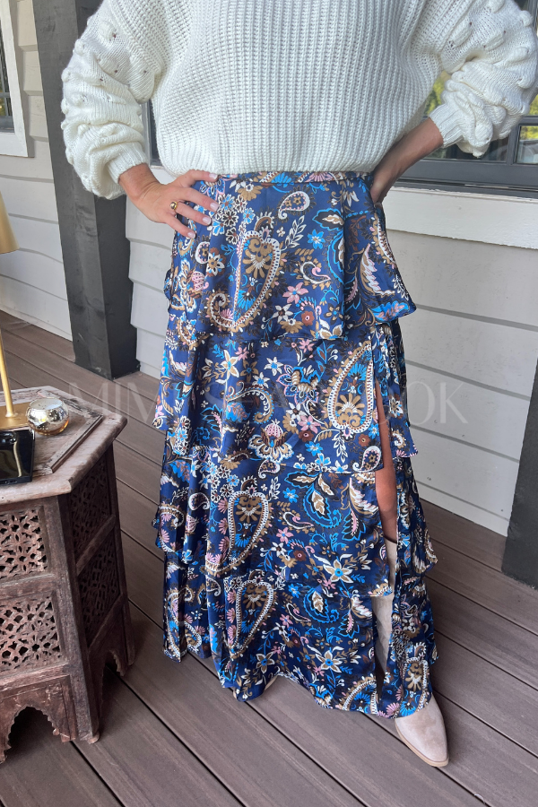Elevate your wardrobe with the Mary Elizabeth skirt, a printed satin tiered maxi skirt designed for effortless elegance. Its flowing tiers create graceful movement, while the smooth satin fabric offers a luxurious sheen. Perfect for both formal occasions and stylish everyday wear, this skirt combines comfort with sophisticated style.