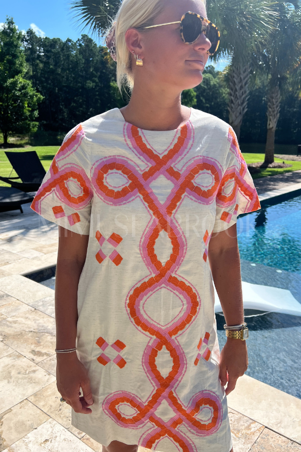 The Monica dress features delicate short sleeves and intricate embroidery, combining elegance with comfort. Its refined design makes it ideal for both casual and semi-formal occasions, offering a timeless addition to your wardrobe.