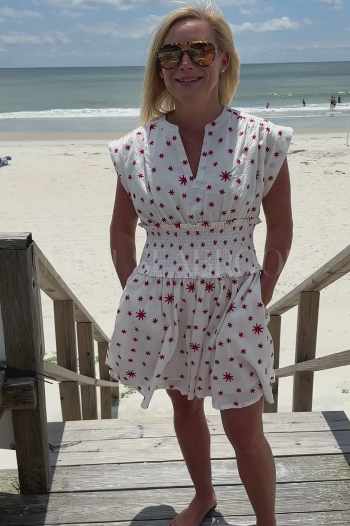 A new take on our classic Roll Sleeve dress! Hand smocking at the waist comfortably hugs your body in an ultra flattering way while the intricately embroidered starry print plays across soft and relaxed cotton.