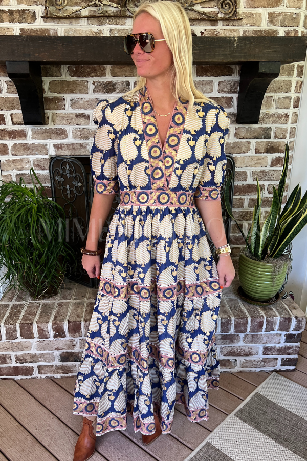 Feel yourself float through life in our V-Neck Cuffed Maxi in the dreamy Agra Navy color-way! Warm blue hand block print paired with gilded accents throughout create a look that is sure to enchant.