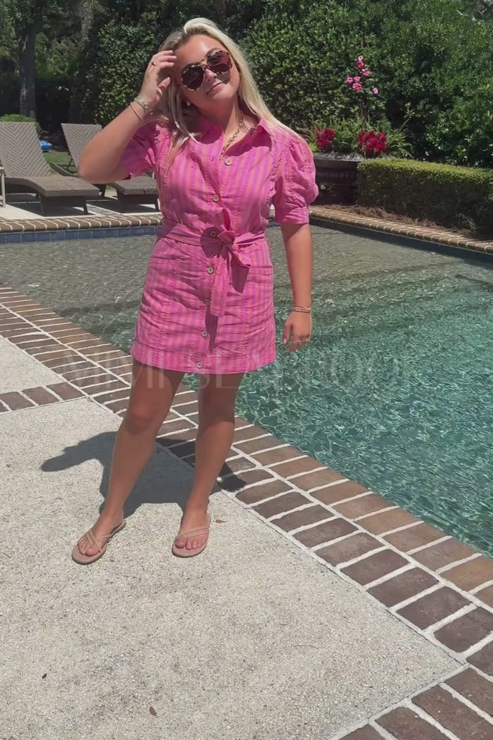 The Weathers dress features a vibrant bold stripe pattern that adds a lively touch to your wardrobe. Designed with a classic collar, it offers a polished and structured silhouette suitable for both casual and professional settings. Its colorful design ensures you stand out with effortless style and confidence.