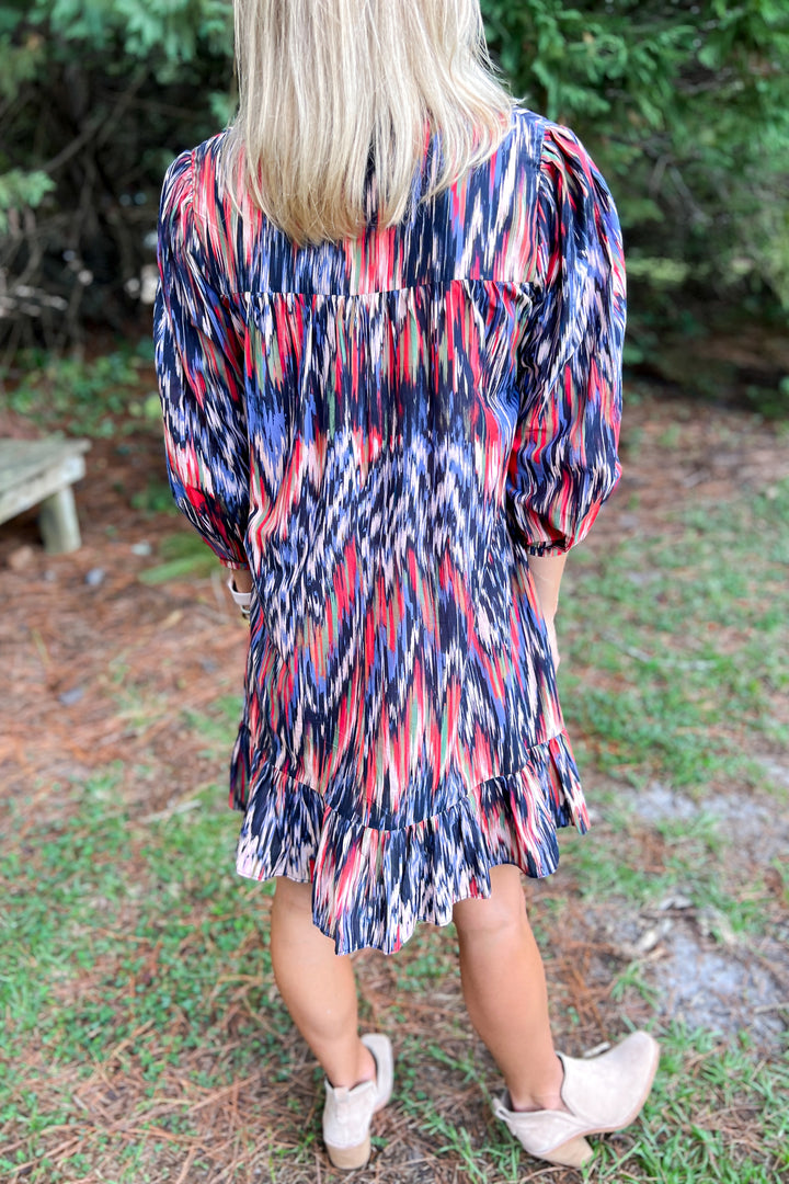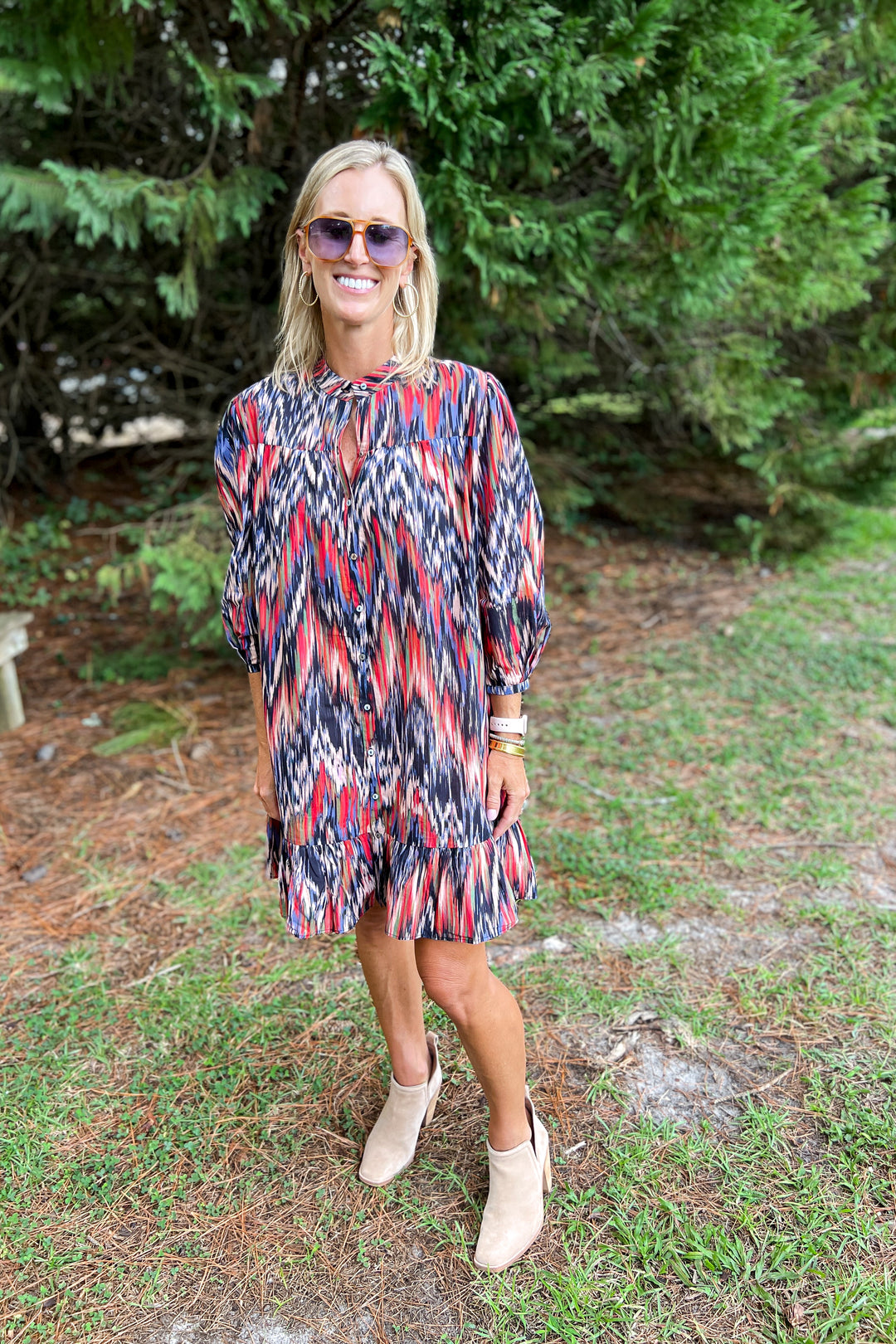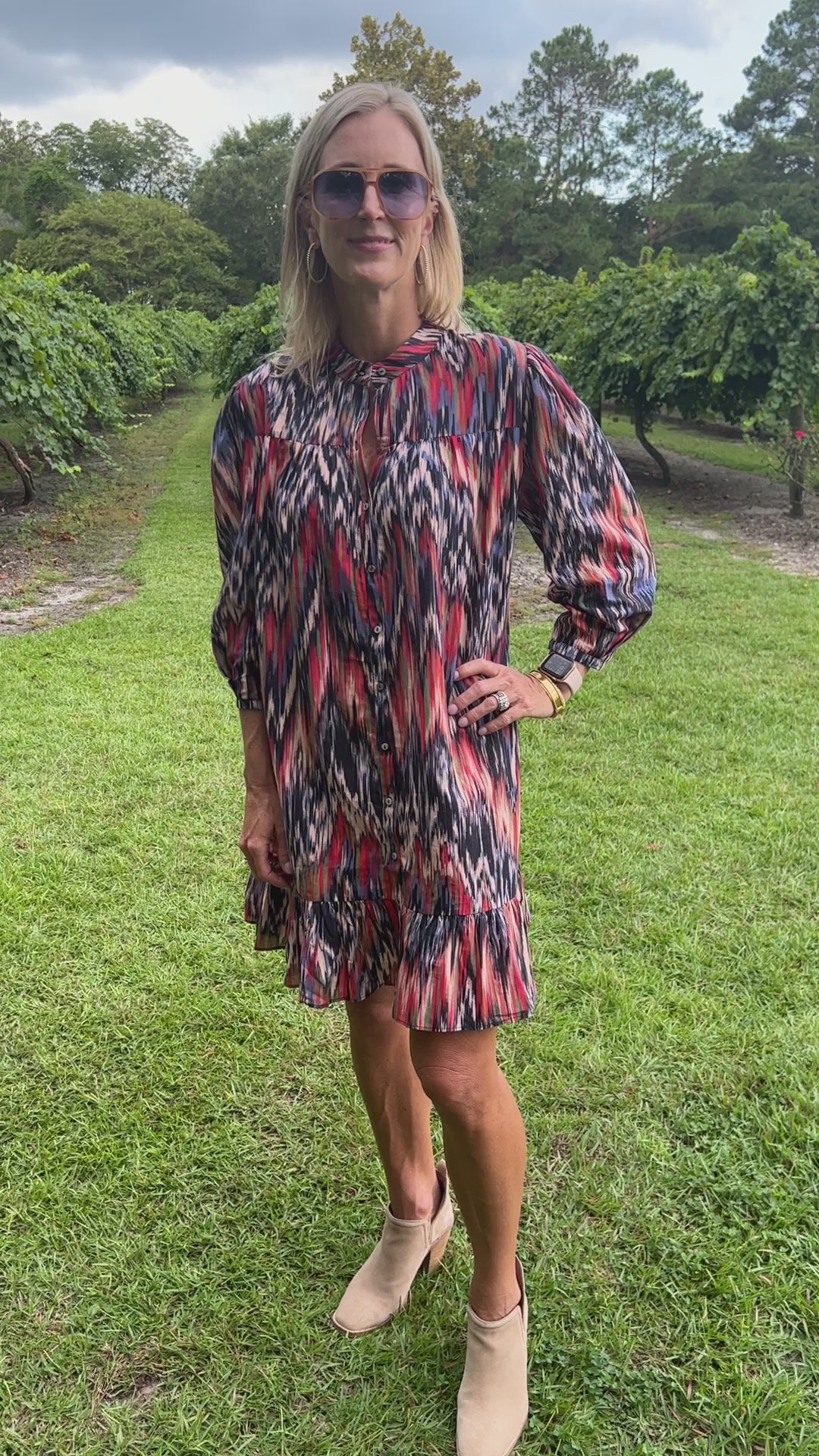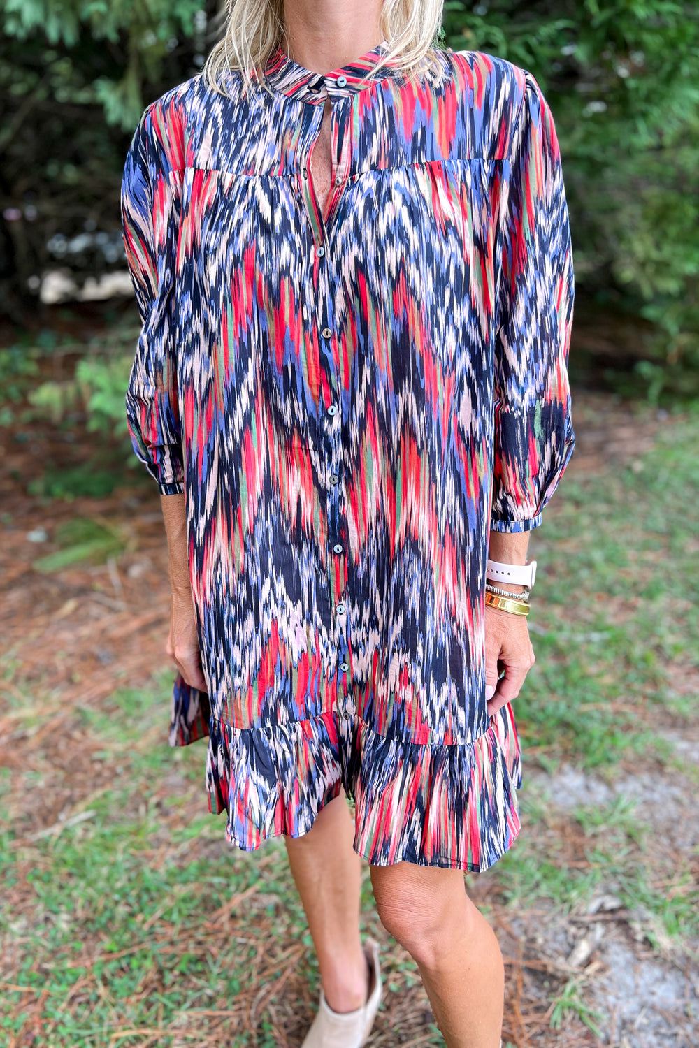 The Yoder dress by King + Pitt is the perfect addition to any wardrobe. Crafted with a unique zig zag print, this piece is sure to turn heads. Its tailored fit falls perfectly over any figure, making it a versatile and flattering option for any occasion. A must-have for sophisticated style, the Yoder dress is the perfect statement piece.